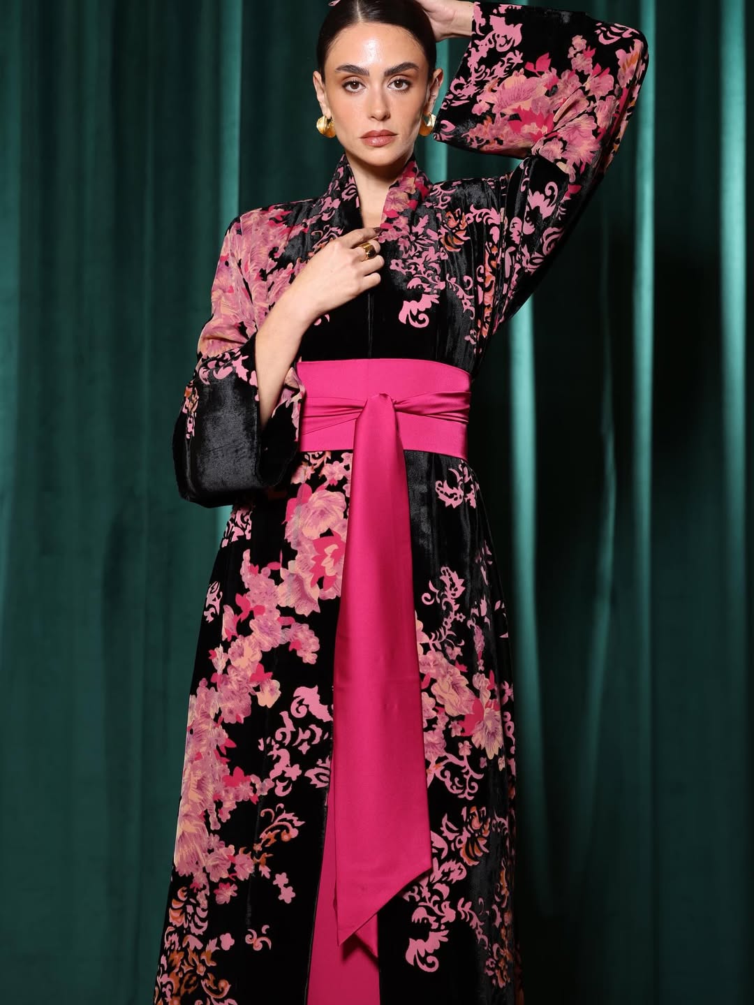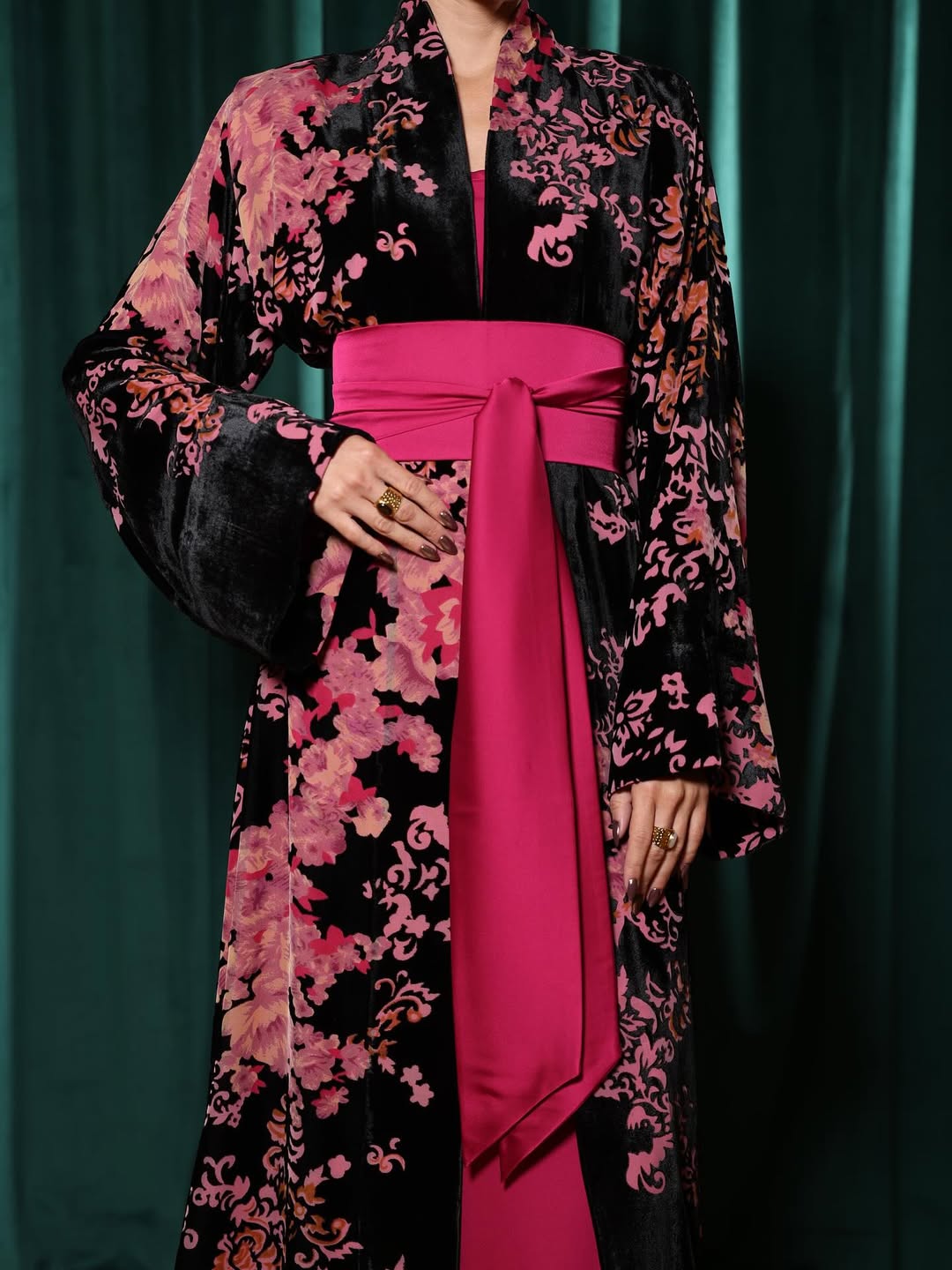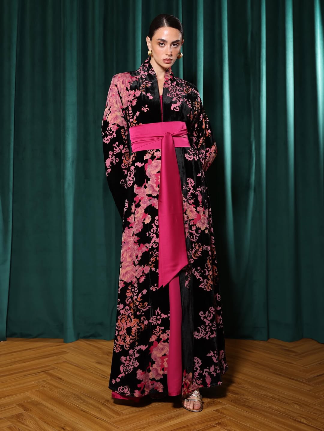 Japanese-inspired jalabiya crafted from chiffon and velvet with an elegant silhouette.