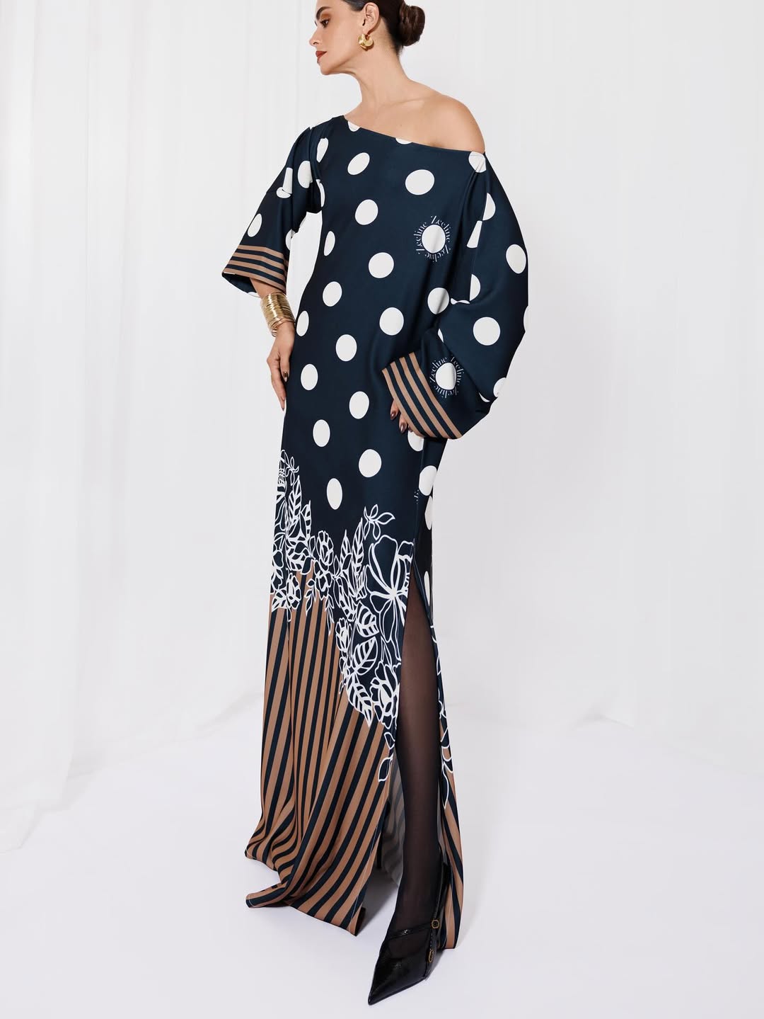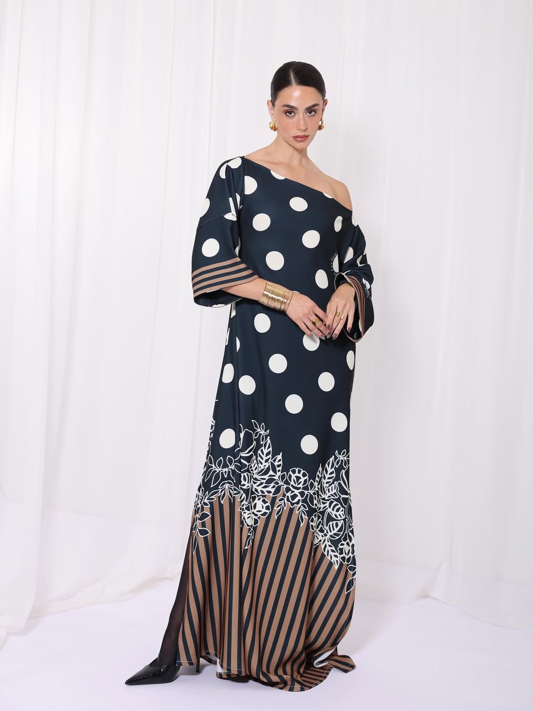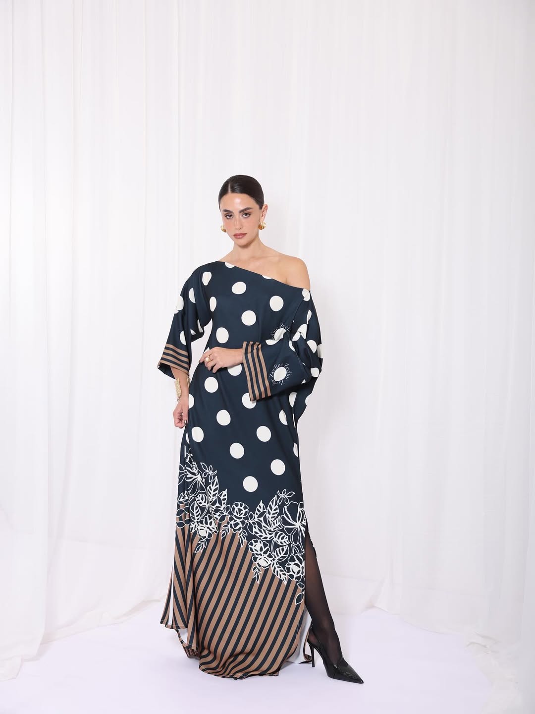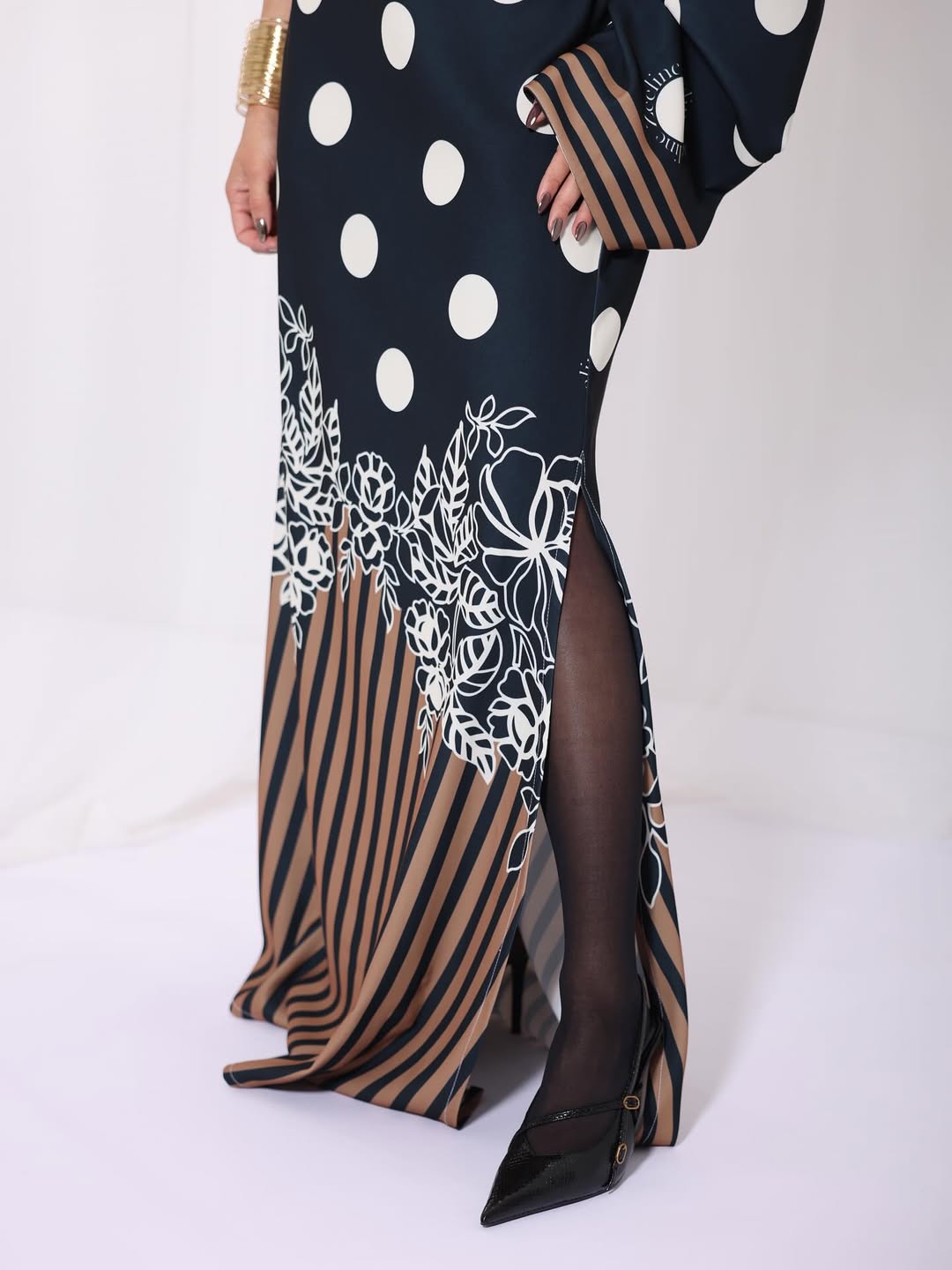 جلابية من قماش الكريب ببرنت خاص بتصميم أنيق ومميز